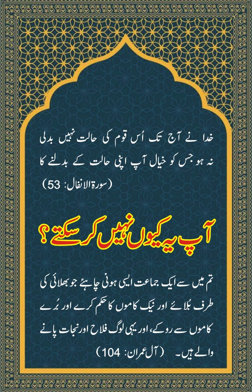 And let there be [arising] from you a nation (group) inviting to [all that is] good, enjoining what is right and forbidding what is wrong. (Aal-e-Imran: 104)